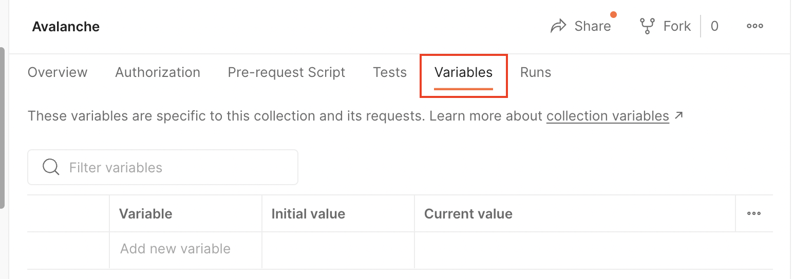 Only default variables are used in the Avalanche Environment file. To learn more about using the secret type of variables, please checkout the Postman documentation.